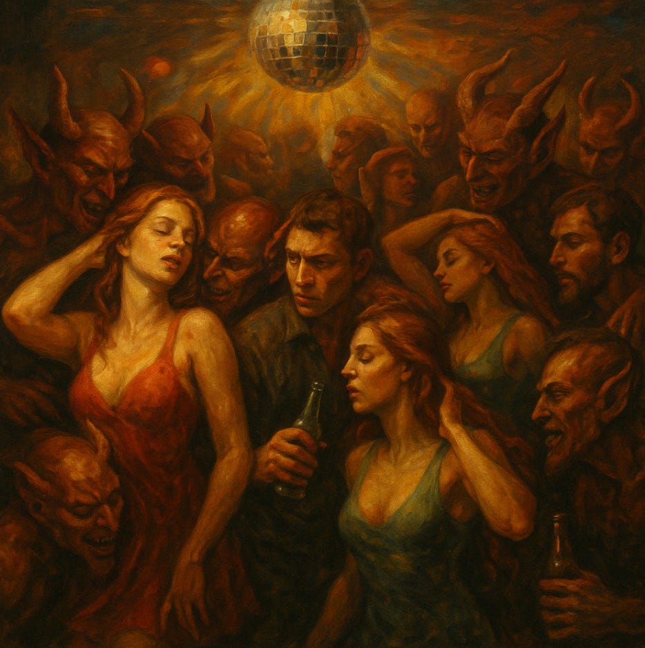 Sometimes I could go a week without any major sinning, other than a few thoughts here and there, but then a weekend would come and a non-Christian friend would drag me to the club. I'd party all night, and the interactions I had at the bar often led to even more sins. There were demons on the dance floor, tempting us all with sin. I see the image like an oil painting, young people on the floor under a disco ball moving their bodies, closing their eyes in ecstasy or looking at the sexy dancers with lust, but behind each person is a demon whispering in their ears, tempting them with sex, drugs, more beer.