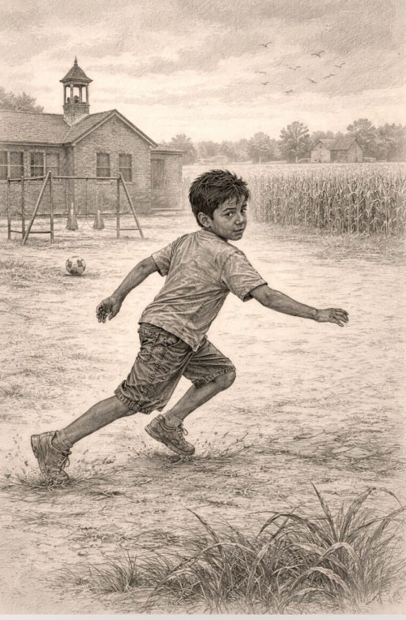 The two-lane highway cut through endless cornfields, like the setting of a Stephen King movie, and when I entered a town whose name I didn’t encode –maybe Gaylord or Gibbon– I slowed, cruising down the main street, thinking it could be a speed trap. I passed an elementary school and it must have been during recess, because kids were playing in the schoolyard. I could hear their screams ricochet in and out of the wind and shoot like sprits into the expanse of cornfields beyond the school. That’s when I saw the brown kid playing with the other kids, only one dark brown, maybe a Mexican maybe an Indian boy among all the white kids. He seemed to be playing tag or some zigzag running game with other boys. I imagined myself inside of the mind of that kid, surrounded by a blur of white faces, whose stories were so different from mine. I realized if I got the job and moved out here from California, I would stand out like that boy. He was another version of me, mi otro yo.